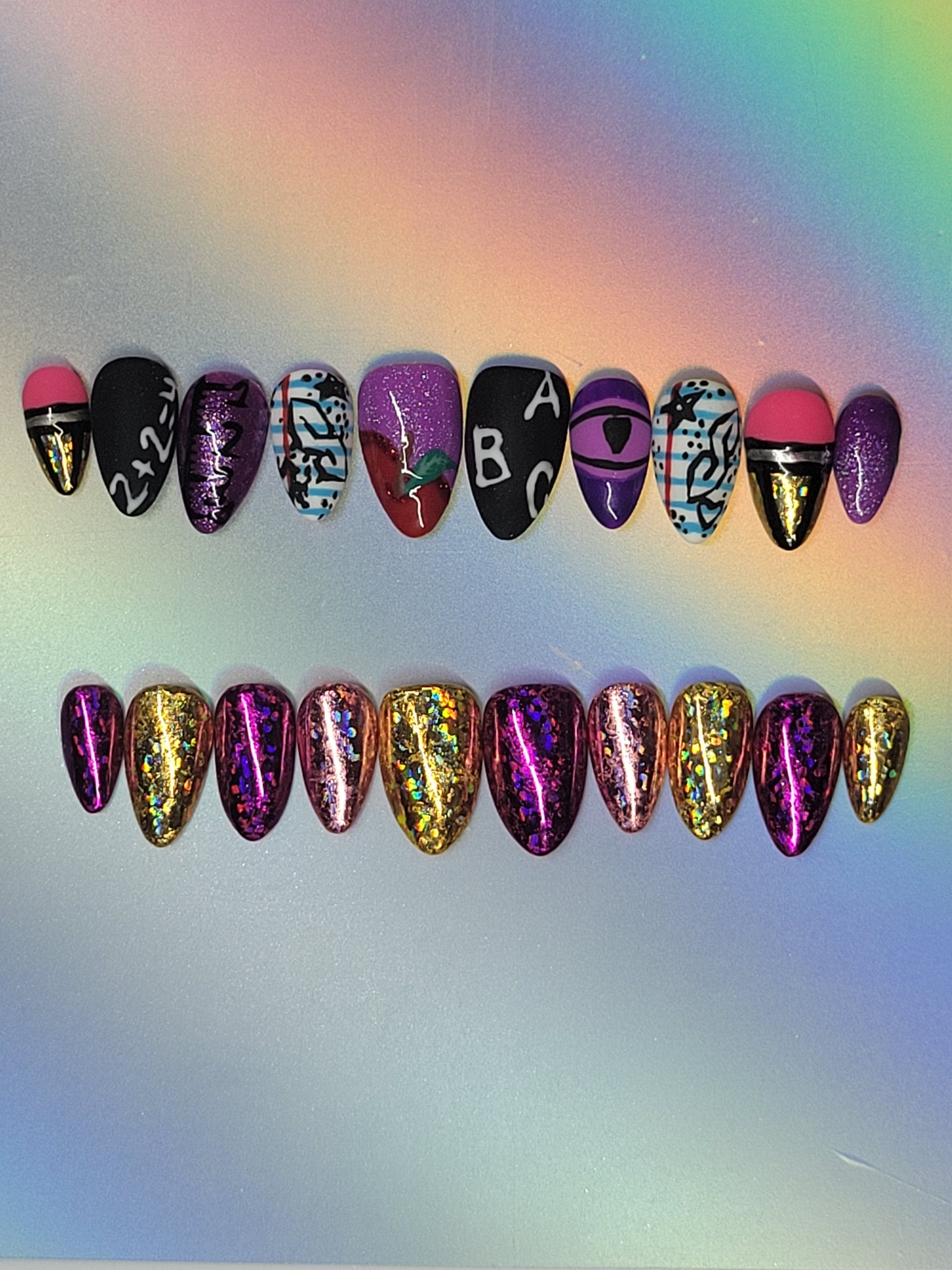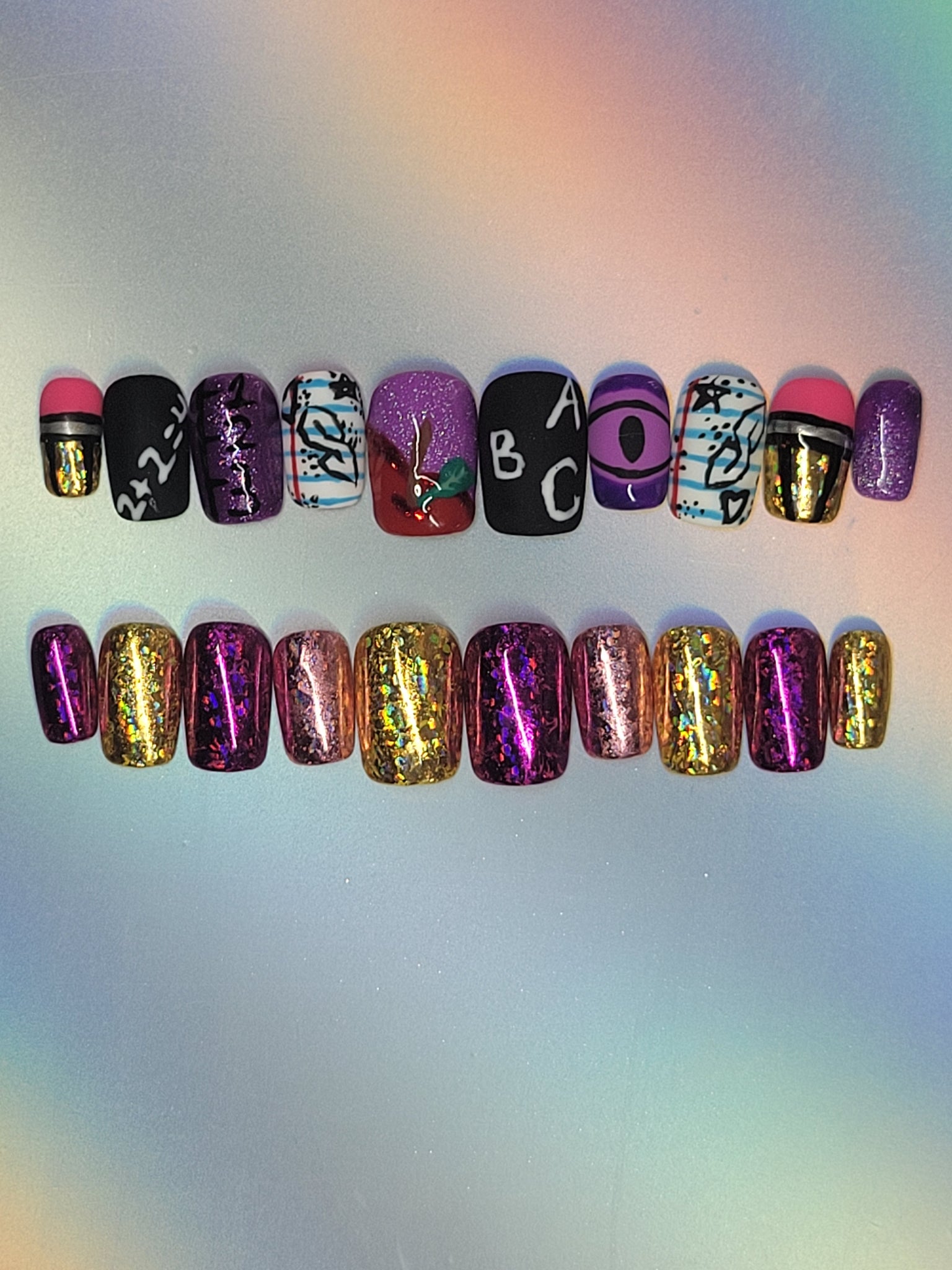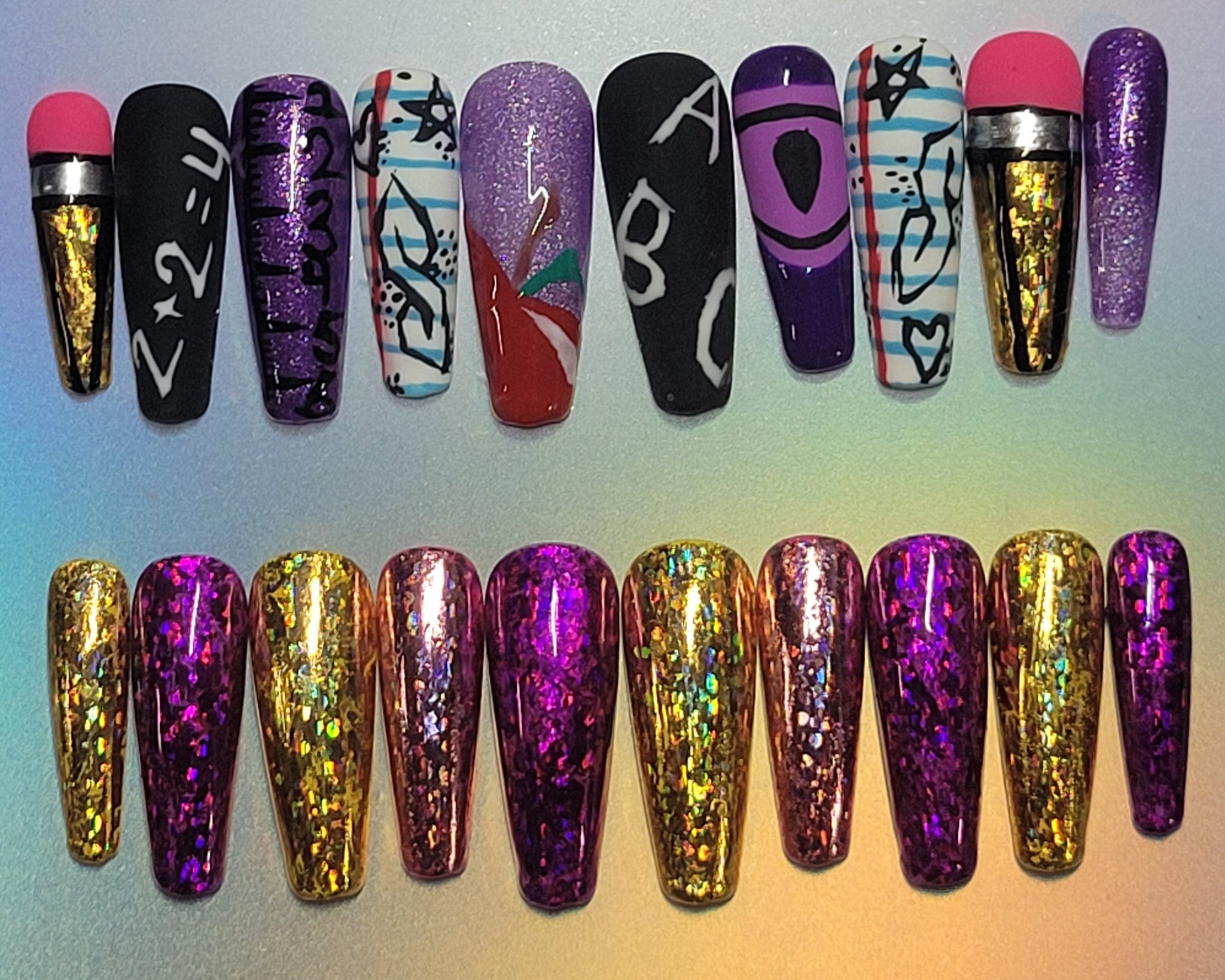 The Good Apple is a Doodle School themed set with purple, yellow, and pink color. Hand painted art, glitter, and foil, topped with a gloss and matte topcoat.