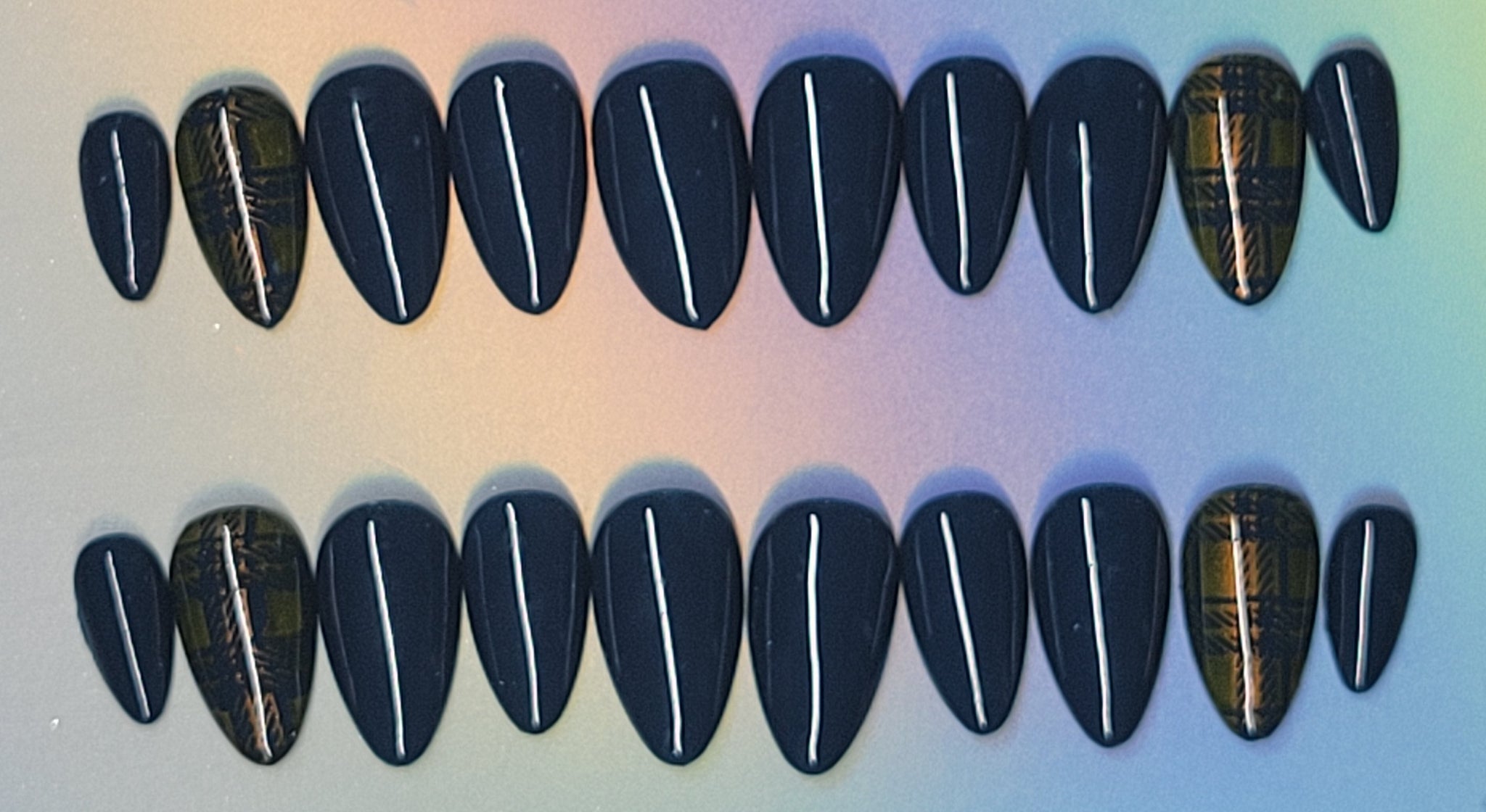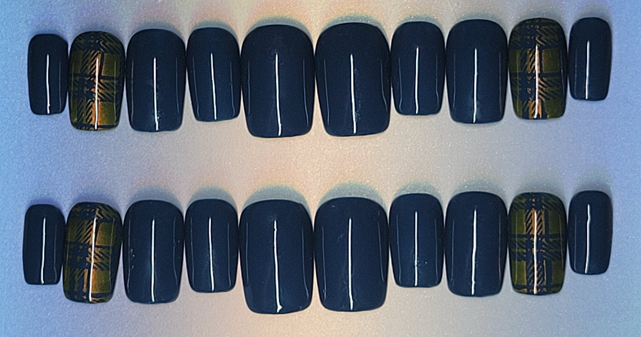 20-piece Press on Nails. Sweater weather is a fall themed emerald and copper gel set, handcrafted with art and topped with a gloss topcoat. Every set comes with 2 alcohol wipes, nail file, nail glue, cuticle pusher, and instruction card.